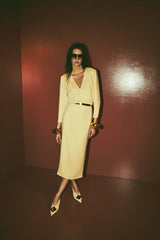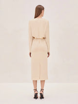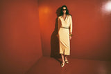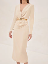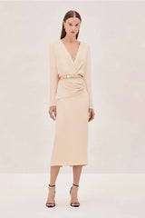 Introducing the Fraser Midi Dress: with a deep V-neckline, flattering draping at the waist, and long sleeves for a sculpted yet refined silhouette that flows gracefully into a sleek midi length.