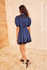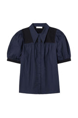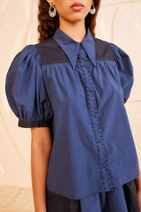 The Freja Top arrives in a colour-blocked palette in deep midnight blue and black. Adorned with puff shoulders, it has a distinctive point collar and a loose silhouette that easily tucks into our coordinating Jaqueline Skirt or handmade denim. It fastens with a buttoned placket traced with handmade French knots for an artisanal touch.