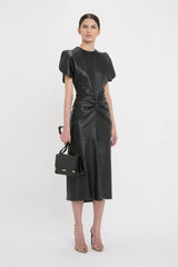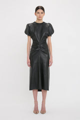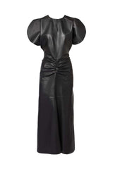 Victoria Beckham's dress is beautifully gathered through the middle to accentuate the waist. It’s made from panels of supple leather and has sculptural tulip sleeves. Wear yours with mules.