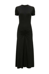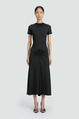 Crafted in stretch jersey for a body-skimming effect, the Gathered Waist T-Shirt Dress has a modest silhouette with round neckline and midi-length hemline. A V-shape seam at the waist with ruching brings a tactile point of difference, while the classic Black colour-way imbues this dress with wear-anywhere appeal.