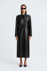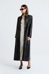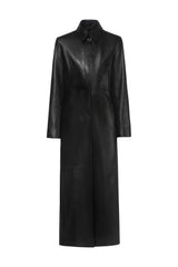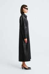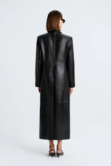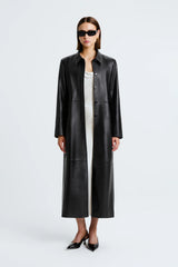 A Nour Hammour icon. The Gotham is a modern take on '90s minimalism, crafted from supple, high-quality leather for comfort and durability. Its elongated construction features a subtle collar, concealed button fastenings, and angled pockets, offering understated elegance.