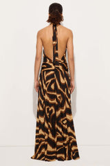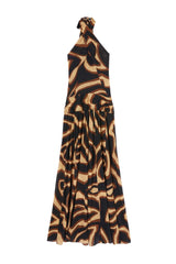 Elegant, dynamic lines define this slub-jersey dress, characterized by a fluid, lightweight structure. The crossover neckline enhances the shoulders, while the low waist gives way to a wide, soft skirt. The Labirinto print in shades of black and gold enriches the garment with intense, sophisticated graphics, striking the perfect balance between rigor and movement.