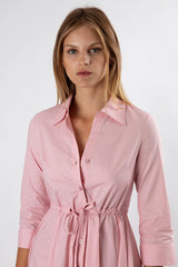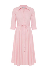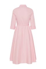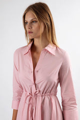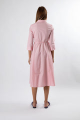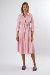 The Hampton Drawcord Dress is a ¾ sleeve shirt dress featuring a drawstring at the waist and pointed collar.
