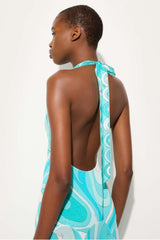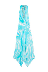 Featuring the houses Marmo print , this sleeveless dress has a deep v-neckline that ties behind the neck with a drop waste silhouette and asymmetrical hemline.