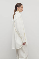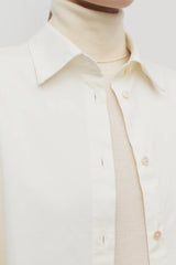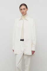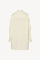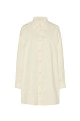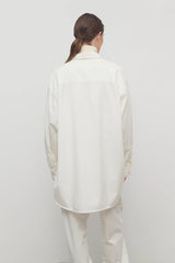 Oversized button-up shirt in cotton and cashmere gabardine with straight hem and exposed front placket with mother-of-pearl buttons.