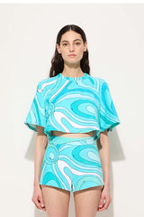 Crafted from soft cotton terry, this top features the houses ‘Marmo’ pattern. This cropped style has been designed for a loose fir and has short sleeves and a round neckline. For the complete look, style them back with their coordinating shorts.