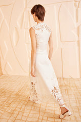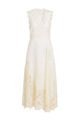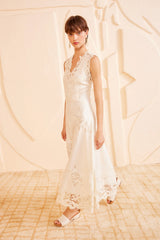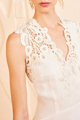 Effortless and romantic, the Olivette Dress is made from pure white linen with intricate floral lace panels that are uniquely engineered to the silhouette. This sleeveless dress has a V-neckline and flows to an ankle-grazing hem that moves beautifully. It is unlined and fastens with a concealed side zipper.