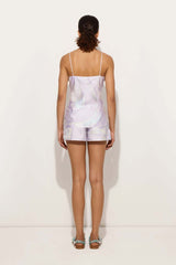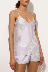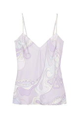An essential top, but with that sophisticated touch that makes it special. This camisole style with a V-neck and thin straps is perfect for those who love casual elegance, ideal for accompanying you in style from hot days to sophisticated evenings.The silk twill, with a slightly textured finish, enhances the natural luster of the fabric and ensures a fluid yet never dull fit. The Orchidee print in a lilac hue adds a delicate and feminine accent.