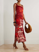 An ankle-length dress crafted in shiny jersey, featuring one of Johanna Ortiz’s signature architectural prints. The gathered waistline and fluid drape create a flattering silhouette that moves beautifully—perfect for daytime gatherings that transition effortlessly into evening moments.