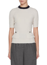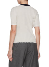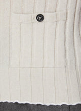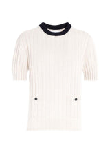 Knitted in cashmere with a flat ribbed pattern, this top is embellished with discreet pockets integrated into the knit and fastened with navy porcelain buttons. The collar, highlighted in navy tone, adds contrast, while a contrasting rolled edge adds a modern touch of luminosity to the silhouette.