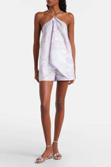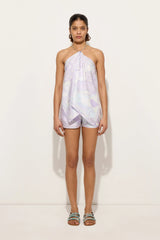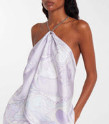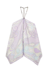 Sliding lines and precious details define the elegance of this flowing top in pure silk. The design features a halter neckline that leaves the shoulders bare and enhances the décolleté with a refined touch. Completing the look, a gold chain applied to the neck adds light and a jewel-like accent. The lavender Orchidee print, inspired by oriental aesthetics and nature reinterpreted by Pucci, envelops the silk with a harmonious movement.