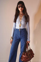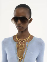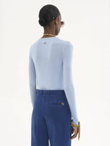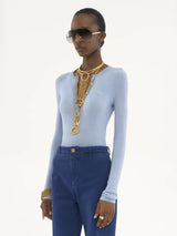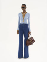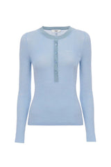 Knitted Henley shirt in lower-impact superfine wool, featuring a silk Tunisian collar and mother-of-pearl buttons. A Chloé logo signs the chest, while a hand-applied Marcie buckle adorns the back.