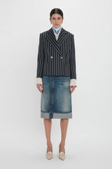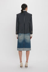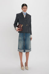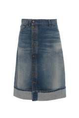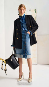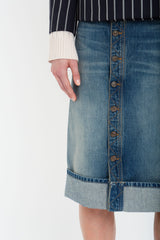 A contemporary twist on the traditional denim skirt, the Placket Detail Denim Skirt reflects the house’s elevated approach to reimaging luxury denim for the modern consumer. Defined by a distinctive asymmetric front placket closure with antique copper branded denim shank buttons and folded hem detail, it embodies sophisticated sexiness. Tobacco topstitching and a branded leather patch at the back of the waist complete the look.
