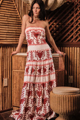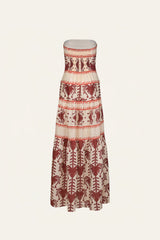 A strapless maxi dress cut in light linen. Defined by its tiered silhouette in ecru and marsala. The artisanal motifs and easy drape make it a versatile piece for warm-weather occasions. Dress it up with statement jewellery from the collection.