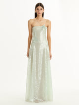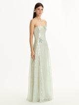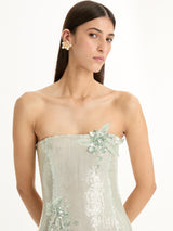 Oscar de la Renta’s collection celebrates the freshness of the season through delicate floral details, rich textures, and flowing silhouettes. Soft colours and refined craftsmanship create an elegant, light, and joyful expression of spring. Finished in shimmering sequins, this strapless A-line gown blooms with contrasting floral appliqués at the bodice and waist.
