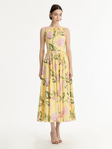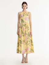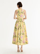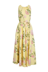 Blooming branches vine across this butter-yellow dress fashioned with a gathered neckline and wrapped with an apron-style skirt fastened with narrow ties.