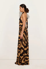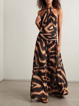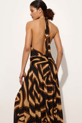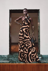Elegant, dynamic lines define this slub-jersey dress, characterized by a fluid, lightweight structure. The crossover neckline enhances the shoulders, while the low waist gives way to a wide, soft skirt. The Labirinto print in shades of black and gold enriches the garment with intense, sophisticated graphics, striking the perfect balance between rigor and movement.