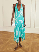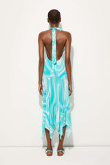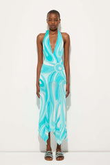 Featuring the houses Marmo print , this sleeveless dress has a deep v-neckline that ties behind the neck with a drop waste silhouette and asymmetrical hemline.