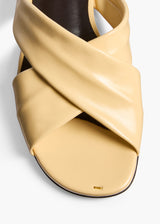 Spotlighting exquisite materials such as glossy Italian calfskin, this softened variation on a classic, slide is defined by broad, criss-crossed straps designed to both hug the foot and drape over it.