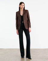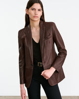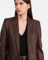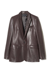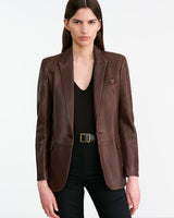 Slim fit blazer jacket in leather. Shoulder pads. Chest welt pocket. Pockets with flaps. Side panels. Logo horn buttons. Centre back seam detail. Interior pocket. Back vent. Fully lined.
