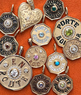 A stunning gold talisman to carry with you, wherever you may go. The Mini PB Charm Necklace features a faceted emerald bezel, and the hand-painted enamel inscription reads 'Porte Bonheur', French for Lucky Charm. On the backside of the coin, you find a delicately engraved star, another powerful symbol of guidance and good fortune.