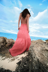 A halter-neck linen dress with a plunging neckline and tiered skirt. Its airy silhouette is designed for ease and movement, making it an ideal choice for warm-weather dressing.