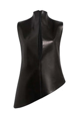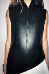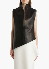 A sleek silhouette made striking by decisive lines and assured angles. Framed by darted stand collar and deeply slit neckline. Concealed zipper closure at back. Discreet hook-and-eye closure at centre front.