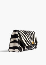 A flap-front clutch that combines refined lines with soft curves in zebra-striped hair-on calfskin, at once supple and pristine. Art Deco-inspired Empire hardware at magnetic closure. Nappa-lined interior with card pocket.