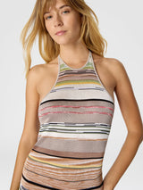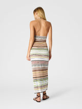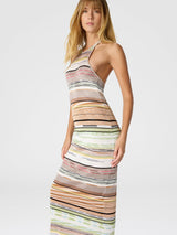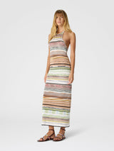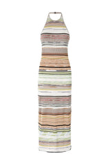 A long sleeveless women’s dress that celebrates femininity with a halter neckline and open back. The flame-effect striped motif gives movement and lightness to this piece in pure viscose, enhancing the silhouette with natural and refined elegance.