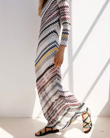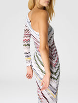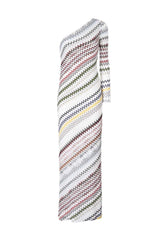 Fluid lines and precious textures define this one-shoulder long dress in viscose and cotton, featuring raschel workmanship in micro chevron.
