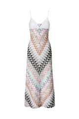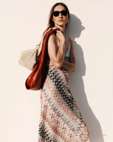A long women’s dress that celebrates Missoni’s ultra-feminine elegance. The contrasting V-neck top with thin straps enhances the body’s line, while the skirt in viscose and lamé blend, enriched with raschel lace in zigzag pattern, adds movement and depth. A play of light and detail turns the piece into a sophisticated expression of the maison’s style.