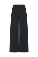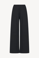 Bias-cut pant in smooth wool viscose suiting with slim gathered elastic waistband and fluid wide leg.