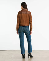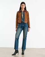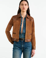 Fitted zip up collared jacket in Italian calfskin. Western details. Zip front in signature antique brass. Welt pockets. Logo horn buttons at cuff. Back seam. Fully lined.
