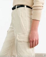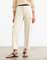 Flat front, mid-rise, relaxed straight leg pant. Cargo pocket details. Back pocket flaps. Hidden button closure.
