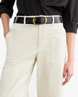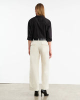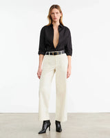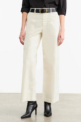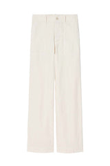 Flat front, mid-rise relaxed straight leg pant in brushed stretch twill cotton. Front patch pockets. Back patch pockets with flaps. Back darts. Zip fly. Button closure. Belt loops.