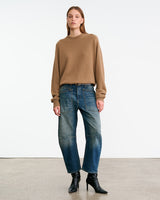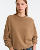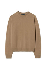 Medium weight sweater in jersey stitch. Relaxed fit. Long body length. Long sleeve length. 1x1 rib at cuff and hem. 1x1 rib neck trim, single layer. Fashioning at sleeve, raglan seam, and neck. Signature centre back cable knit detail.