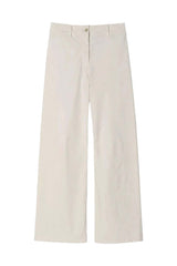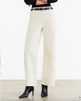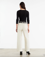 Mid-rise cropped wide leg pant. Fitted through waist and hips. Cropped ankle length. Opens to a relaxed leg. No front pockets. No outer side seam. Zip fly. Logo horn button closure. Back patch pockets.
