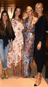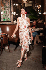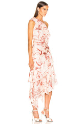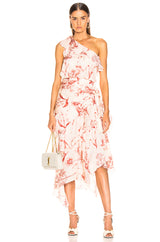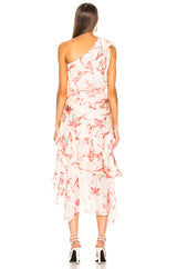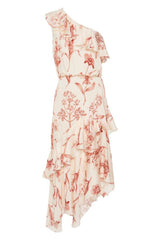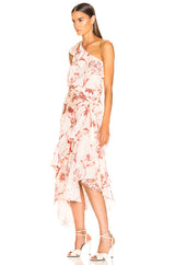 The one-shoulder Inamorado dress from Johanna-Ortiz features an all over floral print. It has a wrap around scarf detail with tassel trim and a tiered asymmetrical ruffle skirt.