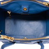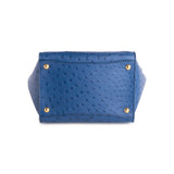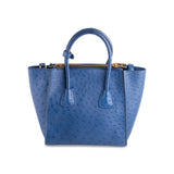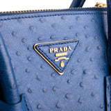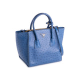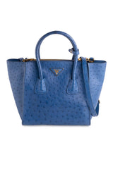 Add timeless style and luxury to your look with this stunning Prada Twin tote. Crafted in blue ostrich leather, this bag can store all that you need in its spacious interior. The tote is detailed with the brand logo on the front, held by dual handles, and protected by studs on the base.