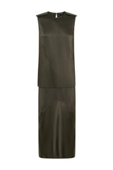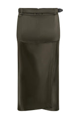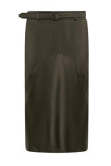 This utility inspired satin skirt from Tom Ford features panelled top stitching detail, a self covered belt, a midi length and an off-centred rear vent. For the complete look style it back with its matching satin top.