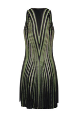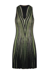 This metallic knit dress from Roberto Cavalli features a deep V-neckline and splices of fluorescent lime green, pale gold and black. Artfully engineered, the ribbed pattern pulls in at the waist for a slim fit before flaring out at the skirt for a flirty silhouette.