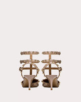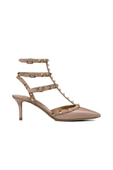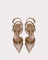 These Valentino Garavani Rockstud ankle strap heels have been crafted in Italy in patent leather. They feature platinum finish studs, contrast powder colour nappa leather piping and ankle straps with adjustable buckle closures.