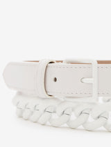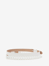The Double Bet with Chain in Optic White is the perfect styling piece to add to your wardrobe. Crafted in white calfskin leather, this thin double belt has a white-finish, chain detailing and buckles.