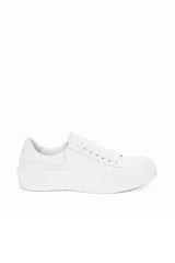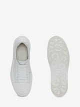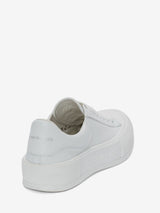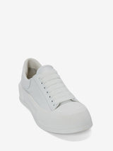 Optic white leather lace-up Deck Plimsoll with a thick oversized rubber sole. The lace-up is detailed with a rubber wrap sole and tonal Alexander McQueen signature.
