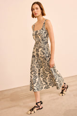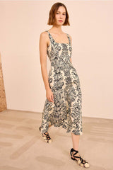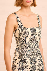 Crafted from signature poplin, the Natali Dress is a timeless, yet distinctive piece adorned with a symmetrical floral leaf print with subtle, batik textures. This black and ivory dress has a square neckline that echoes the ‘90s and a midi-length hem.