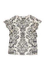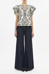 Crafted from cotton poplin, the Severine Top is richly graphic with a symmetrical botanical print infused with subtle, batik textures. This ivory and black top features signature flutter sleeves and is loose in form for easy styling with denim or tailoring.