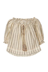 The Paros top is designed for a relaxed fit. The scoop neckline can be adjusted for additional ruching with the centre tie. It has puffed short sleeve and a cropped length. For the complete look, style it back with the coordinating trouser.