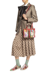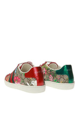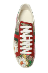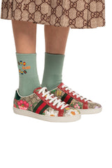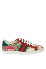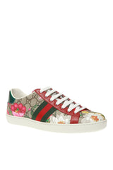 Beige ‘Ace’ lace-up sneakers from Gucci. Made of ‘GG Supreme’ canvas. Embellished with 'Flora’ print and green-red-green 'Web' stripes. Seated on a white rubber sole.