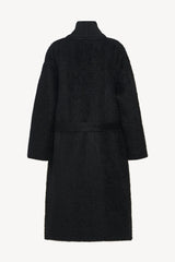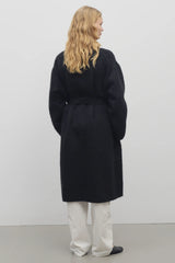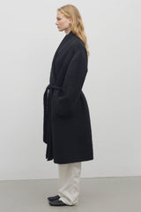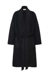 Knee-length wrap coat in textured double-faced alpaca and virgin wool with folded shawl collar, self-belt, and side seam pockets.