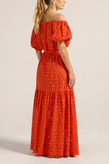 The Antiope Top is crafted from a vibrant red cotton eyelet that makes an unforgettable statement. The off-the-shoulder silhouette features elasticated puff sleeves that add romantic volume and movement. For the complete look, style it back with the coordinating maxi skirt.